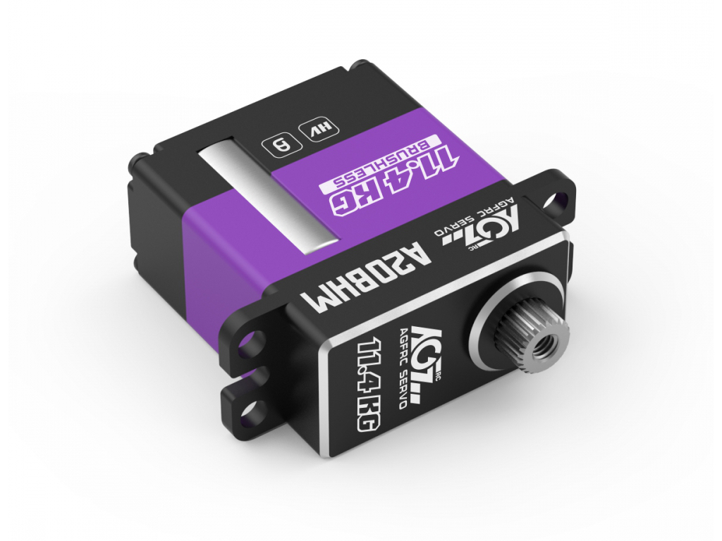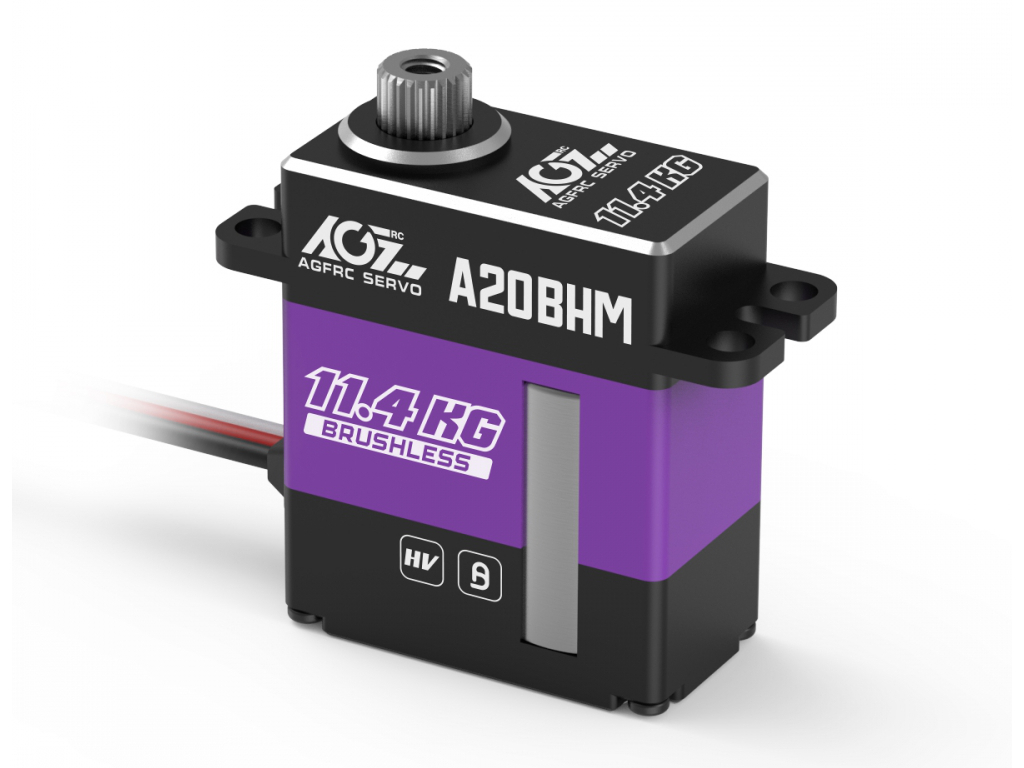 Servocomando mini brushless ad alte prestazioni da 12mm programmabile AGF-RC A20BHM con case interamente in alluminio con ingranaggi in acciaio e una coppia di 11,4Kg per alimentazione da 4,8V a 8,4V. L'A20BHM ha una coppia di 11,4kg*cm a 8,4V ed una velocità di 0,07 60°/sec ideale per applicazioni come maxi alianti o simili dove serve anche una precisione di posizionamento superiore. Grazie ad un elettronica basata su un potente microprocessore i servi AGF sono programmabili tramite interfaccia USB con funzioni fondamentali quali la protezione al sovraccarico, la corsa utile magari per applicazioni come carrelli retrattili di alianti, centraggio e sensibilità utile quando si utilizzano più servocomandi sulla stessa parte mobile per ottimizzare gli assorbimenti.