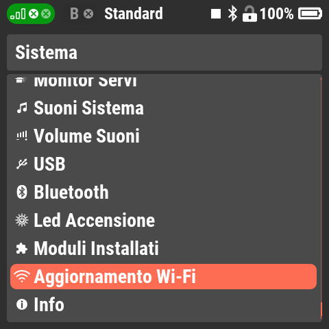 Chiaramente questo aggiornamento si effettua ancora tramite JETIStudio ma grazie al modulo wifi integrato nelle nuove DC/DS-24II, le radio si possono connettere direttamente ad una rete wifi per gestire in maniera autonoma i prossimi aggiornamenti. Per farlo basta andare nel nuovo menù "Aggiornamento Wifi" all'interno del menu di Sistema.