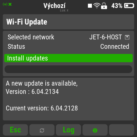 3. Una volta collegati cliccare su "Cerco Aggiornamenti" per avviare la ricerca dal server di JETI. Se presente un aggiornamento verrà visualizzata una schermata con indicato il firmware installato e quello disponibile. Cliccare su "Installa Aggiornamento". A questo punto la radio scaricherà l'aggiornamento in maniera autonoma.