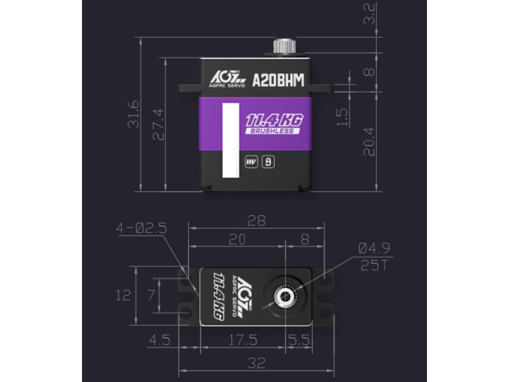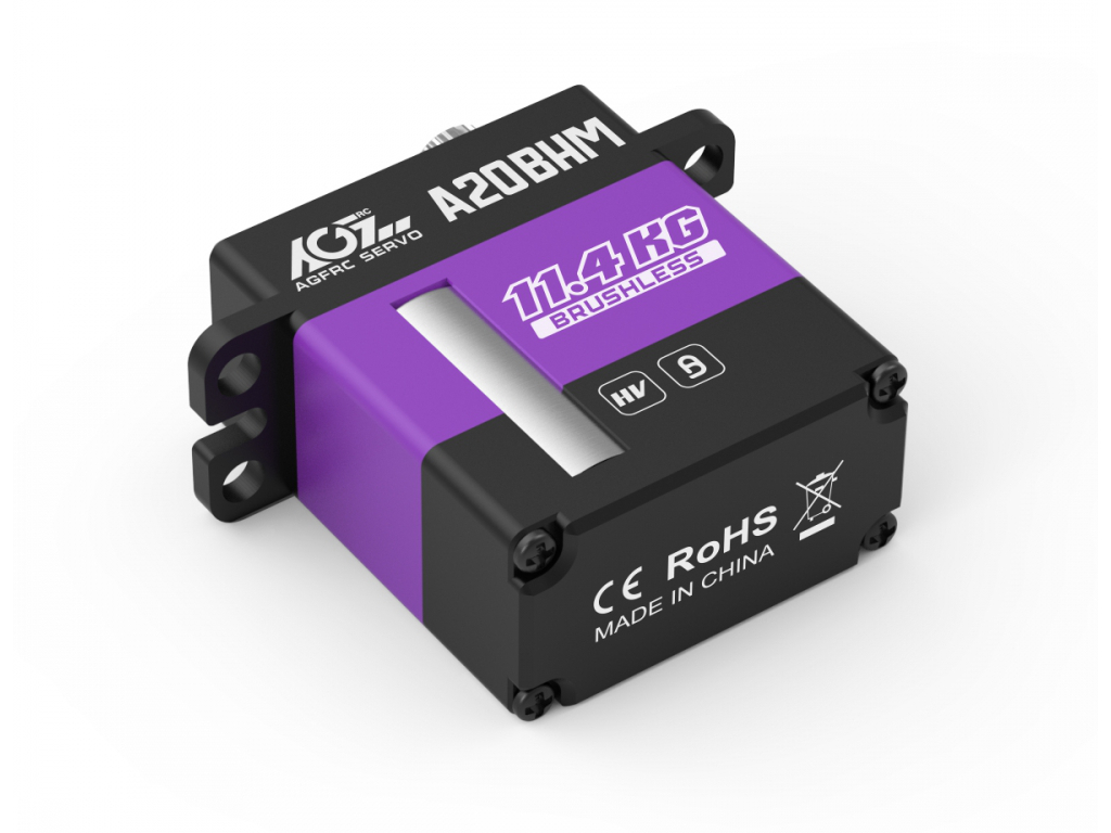 Servocomando mini brushless ad alte prestazioni da 12mm programmabile AGF-RC A20BHM con case interamente in alluminio con ingranaggi in acciaio e una coppia di 11,4Kg per alimentazione da 4,8V a 8,4V. L'A20BHM ha una coppia di 11,4kg*cm a 8,4V ed una velocità di 0,07 60°/sec ideale per applicazioni come maxi alianti o simili dove serve anche una precisione di posizionamento superiore. Grazie ad un elettronica basata su un potente microprocessore i servi AGF sono programmabili tramite interfaccia USB con funzioni fondamentali quali la protezione al sovraccarico, la corsa utile magari per applicazioni come carrelli retrattili di alianti, centraggio e sensibilità utile quando si utilizzano più servocomandi sulla stessa parte mobile per ottimizzare gli assorbimenti.